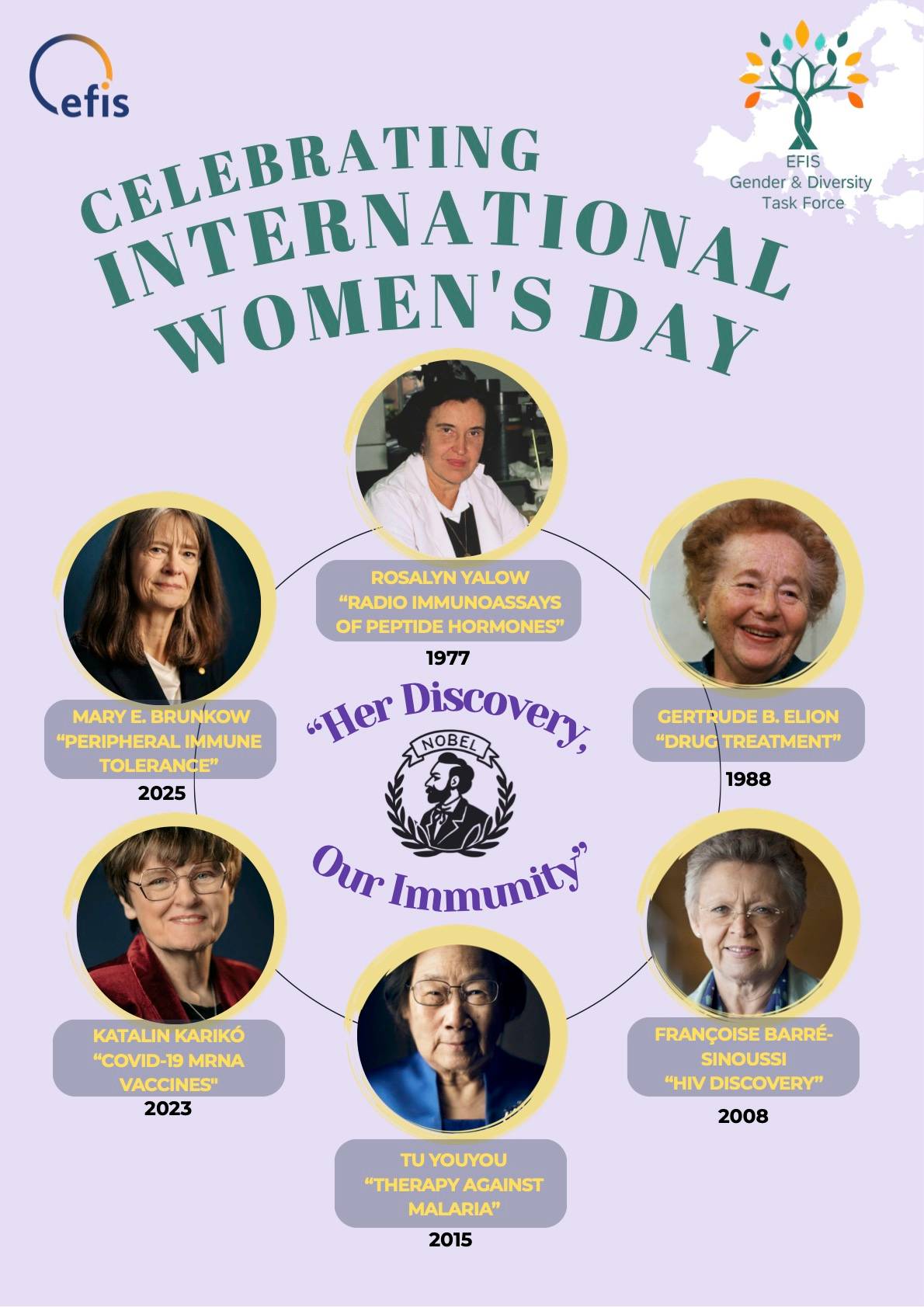 To celebrate International Women’s Day, the EFIS Gender & Diversity Task Force highlights the remarkable contributions of women scientists whose discoveries have transformed immunology and global health. Pioneering researchers such as Rosalyn Yalow, Gertrude B. Elion, Françoise Barré-Sinoussi, Tu Youyou, and Katalin Karikó have expanded our understanding of immune mechanisms and infectious diseases, leading to groundbreaking diagnostic tools, life-saving therapies, and vaccines. Their achievements demonstrate how fundamental scientific discoveries can translate into major advances in medicine and public health. By recognizing these contributions, we also celebrate the countless women scientists whose work continues to advance immunology today. EFIS remains committed to promoting diversity, inclusion, and equal opportunities in immunology, supporting the next generation of scientists who will drive future discoveries and innovations in immune research.