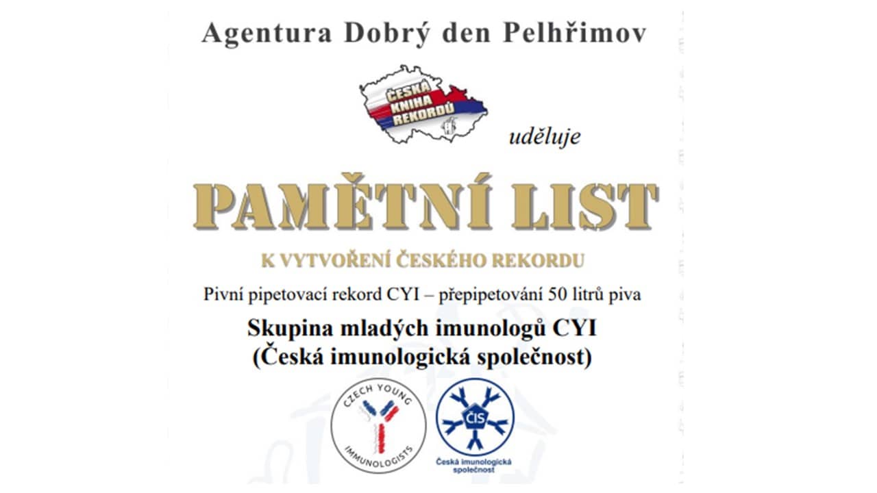 In December 2025, for the traditional St. Nicholas Day celebration, the Czech Young Immunologists of CIS (CYI) participated in a competition for the Czech Guinness Book of Records. Fifty-four CYI members turned to pipette 50 liters of beer using a 1 ml pipette, and it was completed in 32 hours and 15 minutes, a record officially registered that will appear in the 2026 edition of the book! A competition for meeting in fun, friendship, and science.