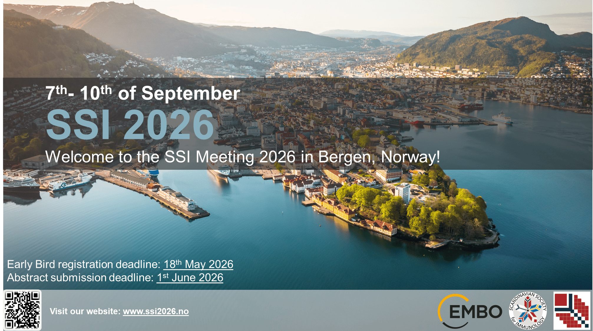On behalf of the Norwegian Society of Immunology, we are delighted to welcome you to the Scandinavian Society for Immunology (SSI) Meeting 2026, from September 7–10 in the beautiful city of Bergen. This international conference will bring together leading immunologists, researchers, and clinicians to share advances, foster collaborations, and inspire the next generation of scientists. We are particularly excited to host a dedicated Immunology School and Pre-Meeting for students and early-career researchers, offering unique opportunities for learning, networking, and mentorship. Travel grants are available to support student and early-career participation, ensuring broad and inclusive engagement. Set against Norway’s stunning west coast, Bergen provides a rich cultural experience and breathtaking natural beauty—an ideal setting for scientific exchange and community building.