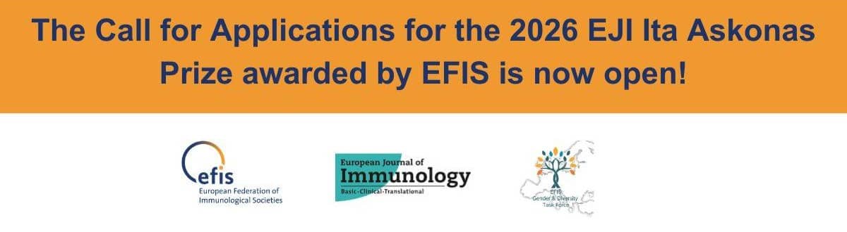 Established in 2009 by EFIS and the European Journal of Immunology (EJI), Ita Askonas Award recognizes exceptional female group leaders in immunology who have led an independent laboratory for a minimum of four and no more than ten years. Nominations are due by June 30, 2026. More about the award and application details are available here.